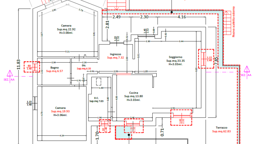 La proprietà con una superficie di mq. commerciali 138 si sviluppa su un unico livello e si compone di ingresso, ampio soggiorno con angolo cottura e accesso alla terrazza abitabile di circa mq. 60, dispensa, due camere matrimoniali, ampio bagno e soffitta. Data l’ampiezza dei vani e la presenza di finestre è possibile realizzare la terza camera e il secondo bagno.
